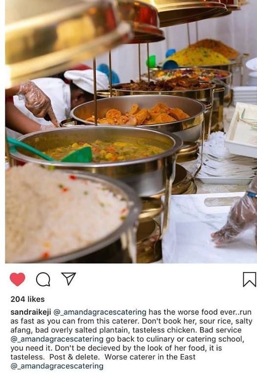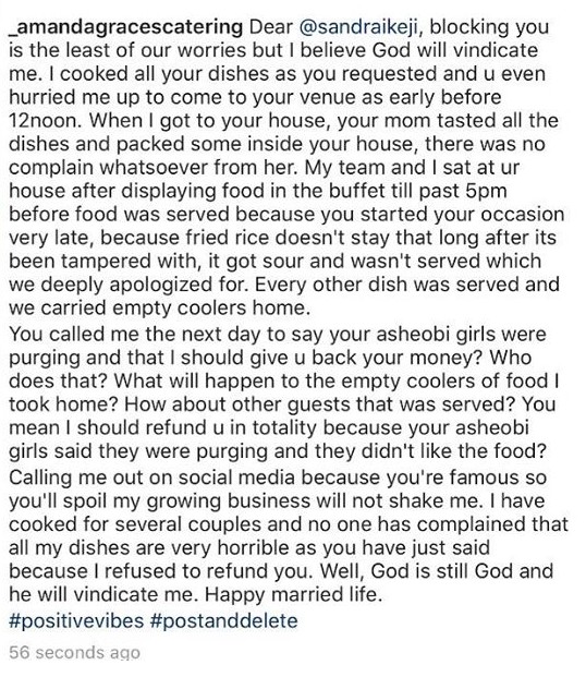 Following her recently nuptial celebration, newly wed bride and sister to celebrity blogger Linda Ikeji, Sandra, has taken to her social media page to call out a caterer identified as Amanda Graces for ‘bad services’ rendered.
