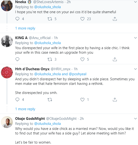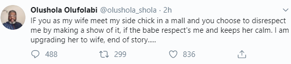 Taking to his Twitter page, Olushola Olufolabi wrote that if his wife disrespects him by making a public show with his side chic, and the lady is able to keep calm, then he is going to upgrade her to his wife.