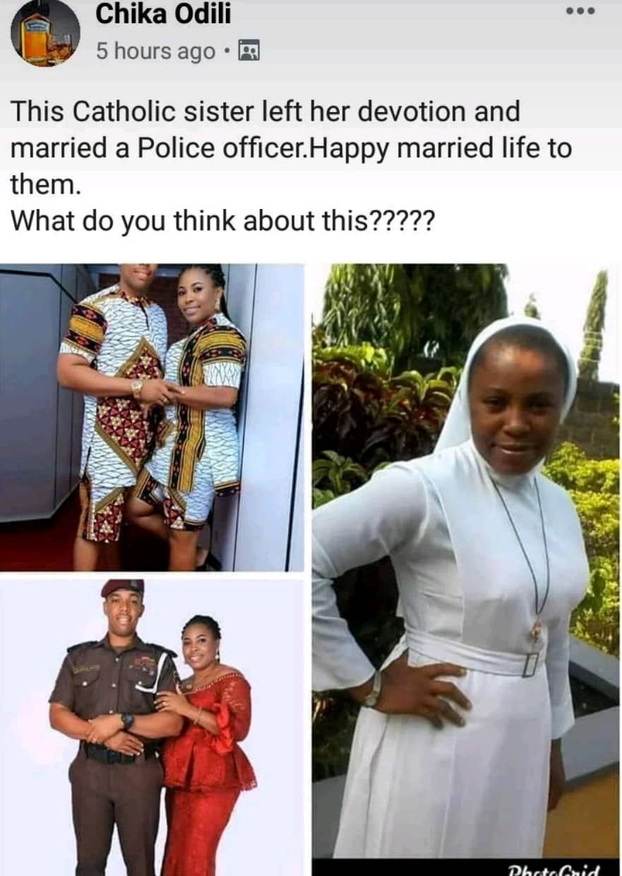 Photos of a Catholic Reverend Sister who quit her religious profession and got married to an officer goes viral online.