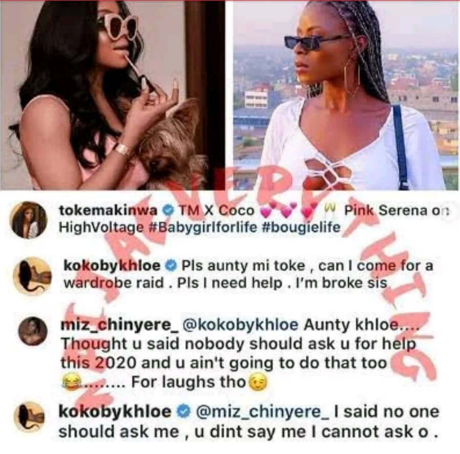 The reality TV star has been caught begging popular radio personality, Toke Makinwa for clothes.