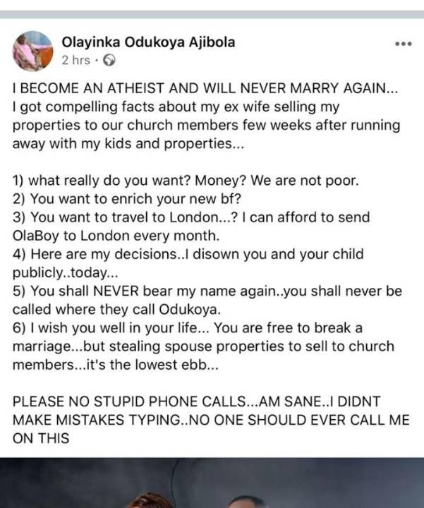 A Nigerian man, Olayinka Odukoya Ajibola has publicly disowned his wife and children and announced his decision to become an atheist after stumbling upon compelling facts about his ex-wife allegedly stealing and selling his properties to church members.