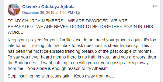 Keep your prayers for your families, we do not need your prayers again..it’s too late for us…..sliding into my inbox to ask questions is sheer hypocrisy…This has been the most celebrated trending breakup of the past couple of months.. To say you never heard means there is no truth in you…and you are worst than the Sadducees …I want nothing to do with you or your gossips…keep away from me… You alone is enough reason to try Atheism….