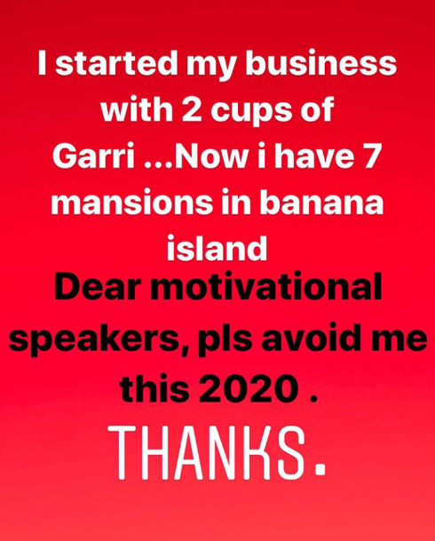 “I Started my business with two cups of garri.Now I have 7 mansions in banana island. Dear Motivational speakers, please avoid me this 2020.Thanks.