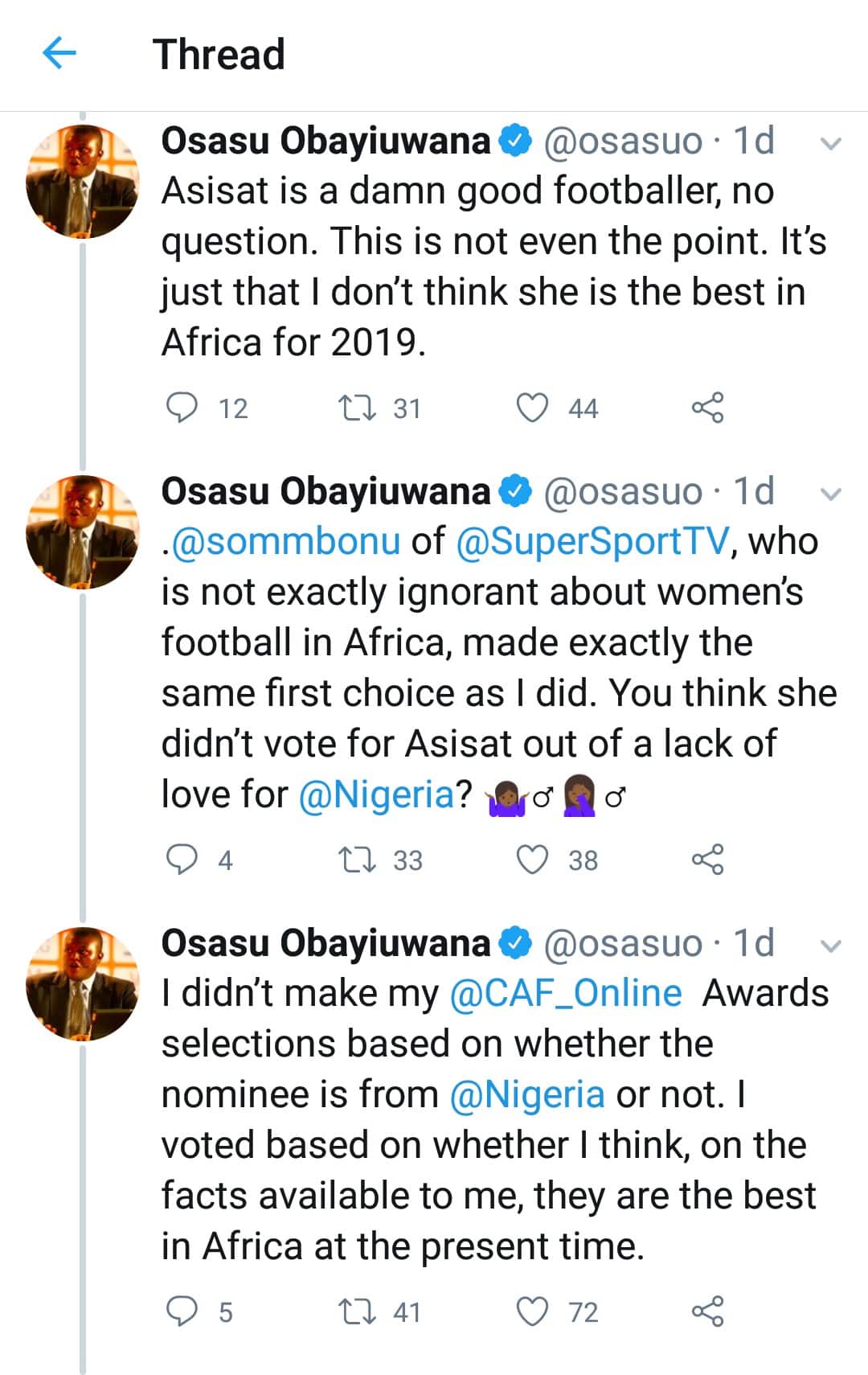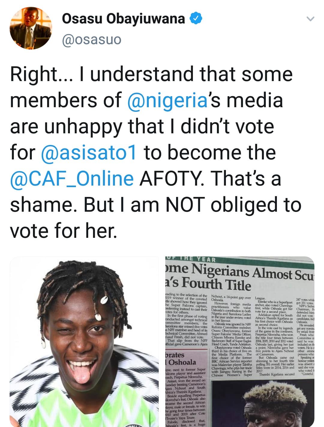 “Right… I understand that some members of @nigeria’s media are unhappy that I didn’t vote for @asisato1 to become the @CAF_Online AFOTY. That’s a shame. But I am NOT obliged to vote for her.