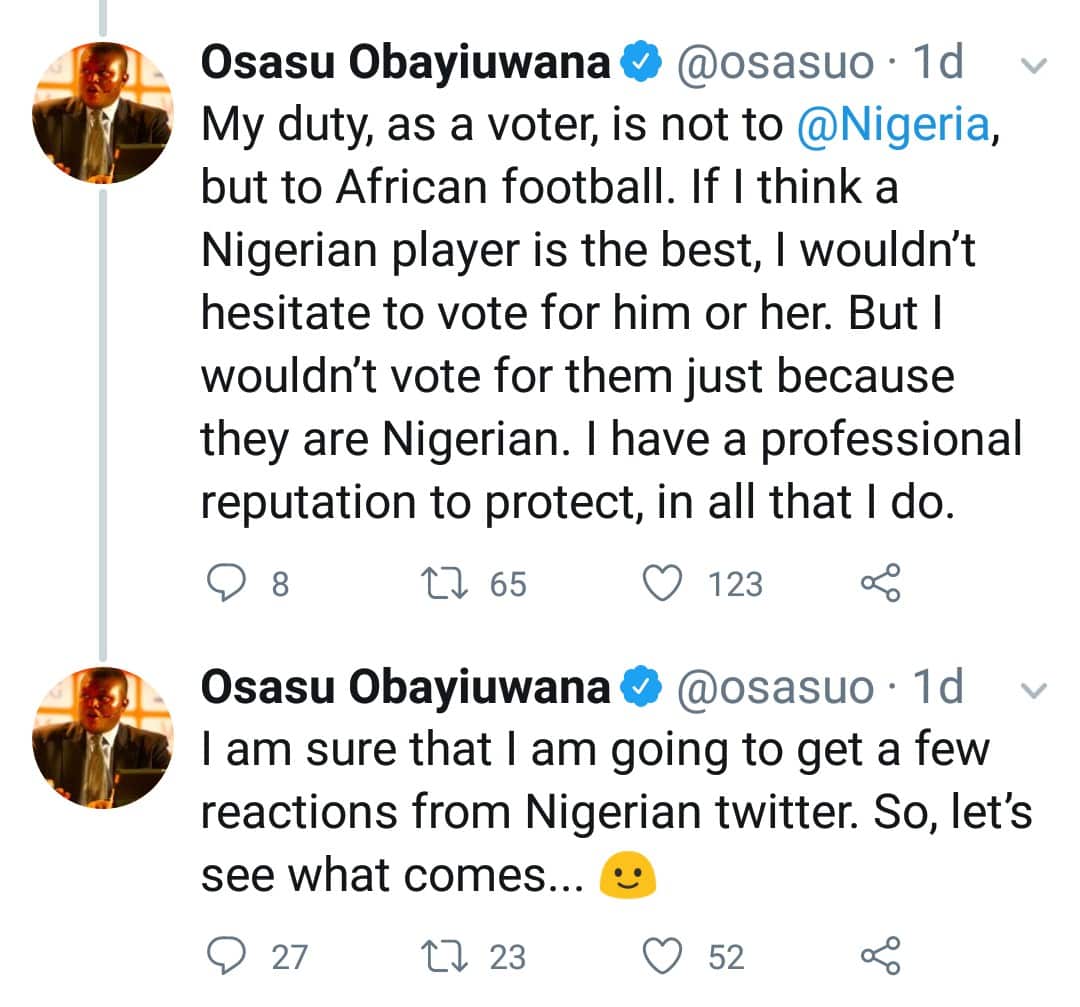 My duty, as a voter, is not to @Nigeria, but to African football. If I think a Nigerian player is the best, I wouldn’t hesitate to vote for him or her. But I wouldn’t vote for them just because they are Nigerian. I have a professional reputation to protect, in all that I do”.