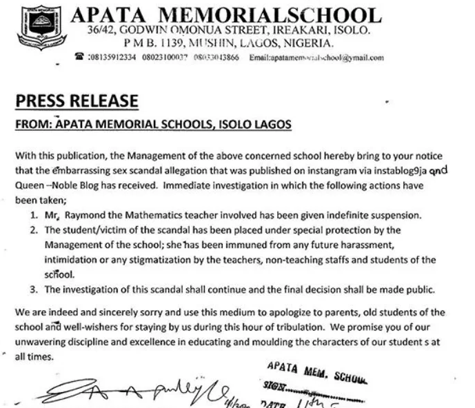 The teacher identified as Mr Raymond is the HOD of Mathematics of the school that was founded by Late Nigerian Army Brigadier-General S. O. Apata, father to the popular entertainers, Teni and Niniola Apata.