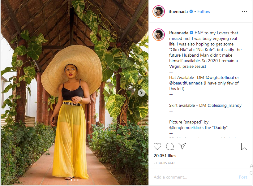 “HNY to my Lovers that missed me! I was busy enjoying real life. I was also hoping to get some ‘Oko Nla’ abi ‘Nla Kofe’, but sadly the future husbandman didn’t make himself available. So 2020 I remain a virgin, praise Jesus!”
