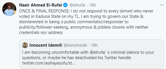 Reacting to Innocent’s tweet, Governor Nasir El-Rufai disclosed that he is not interested in responding to ”publicity/follower-seeking, anonymous and jobless clowns with neither credentials nor address”.