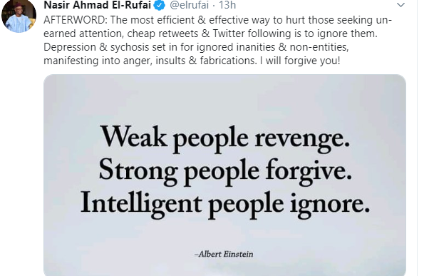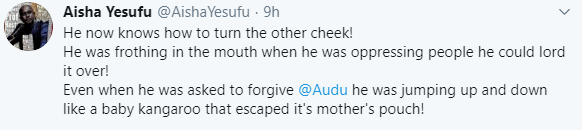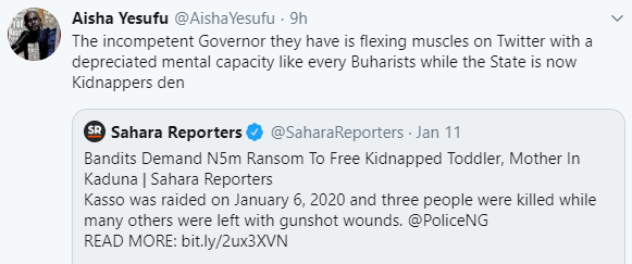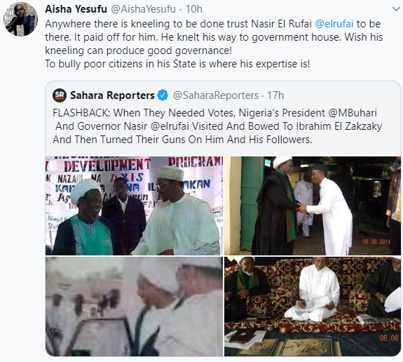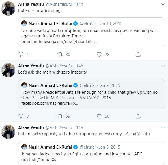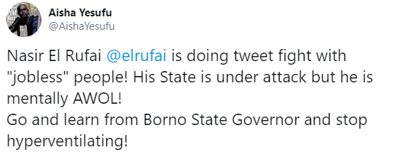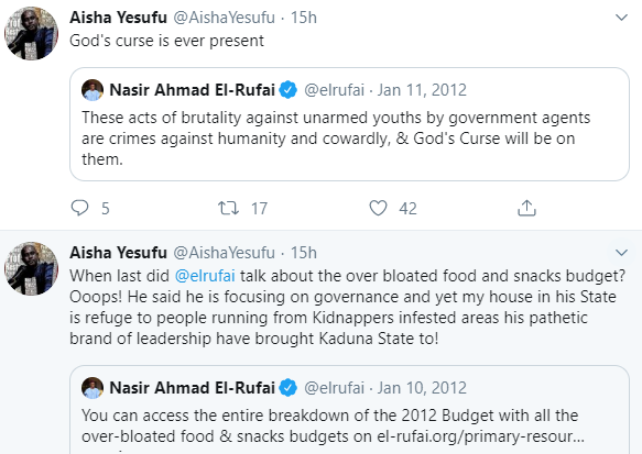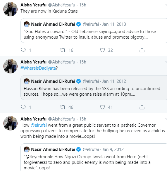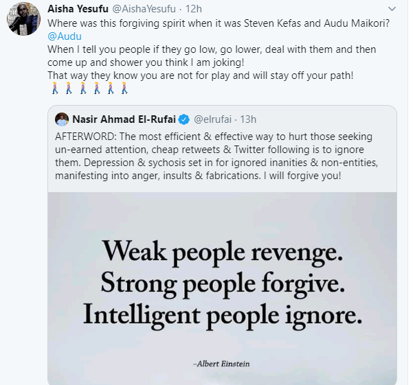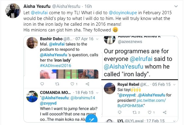 Yesufu recalled old tweets credited to Govenor Nasir El-Rufai where he attacked former President Goodluck Jonathan and Aisha Yesufu promised to deal with the Governor on Twitter street, saying she can never be intimidated by Governor Nasir El-Rufai.