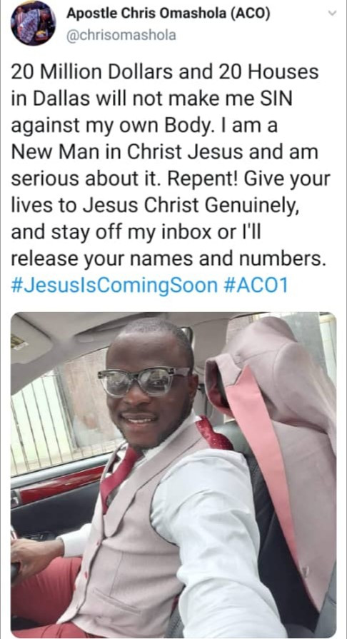 20 Million Dollars and 20 Houses in Dallas will not make me SIN against my own Body. I am a New Man in Christ Jesus and am serious about it. Repent! Give your lives to Jesus Christ Genuinely, and stay off my inbox or I’ll release your names and numbers. #JesusIsComingSoon #ACO1