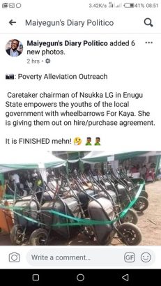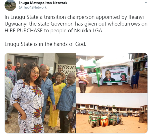 In Enugu State a transition chairperson appointed by Ifeanyi Ugwuanyi the state Governor, has given out wheelbarrows on HIRE PURCHASE to people of Nsukka LGA. Enugu State is in the hands of God.