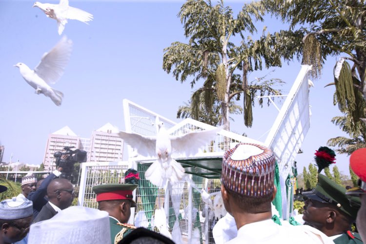 Buhari later signed the anniversary register after which he was supported by the other dignitaries to release some white pigeons to signify peace in the land.
