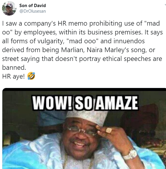 Identified as Olusesan, the twitter user pointed out that a company sent out a memo banning the use of popular Lagos slang, ‘Mad oh’. According to Olusesan, the memo was sent out to the company staff by the HR.