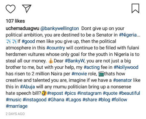 @bankywellington Dont give up on your political ambition, you are destined to be a Senator in #Nigeria… If #good men like you give up, then the political atmosphere in this #country will continue to be filled with fulani herdsmen vultures whose only goal for the youth in Nigeria is to steal all our money. Dear #BankyW, you are not just a big brother to me, but with your help, my #acting fee in #Nollywood has risen to 2 million Naira per #movie role, thats how creative and talented you are, imagine if we have a #senator like this in #Abuja will any mumu politician bring up a nonsense hate speech bill?