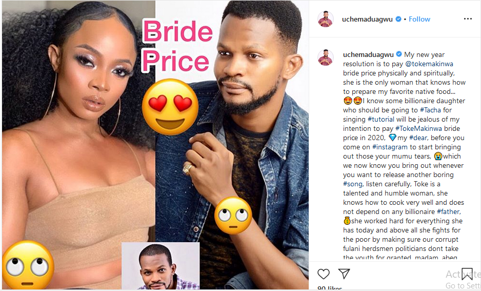“My new year resolution is to pay @tokemakinwa bride price physically and spiritually, she is the only woman that knows how to prepare my favorite native food… I know some billionaire daughter who should be going to #Tacha for singing #tutorial will be jealous of my intention to pay #TokeMakinwa bride price in 2020, my #dear, before you come on #instagram to start bringing out those your mumu tears, which we now know you bring out whenever you want to release another boring #song, listen carefully, Toke is a talented and humble woman, she knows how to cook very well and does not depend on any billionaire #father, she worked hard for everything she has today and above all she fights for the poor by making sure our corrupt fulani herdsmen politicians dont take the youth for granted, madam, abeg when was the last time your billionaire father or you criticize this government?”