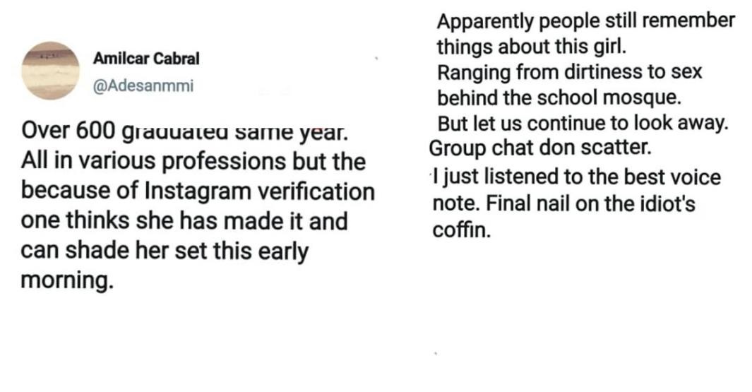 2018 former Big Brother Naija housemate, Busayo Abiri aka Khloe, has been exposed by her former secondary school classmate after she used her social media platform to heavily shade her ex- secondary school mates.