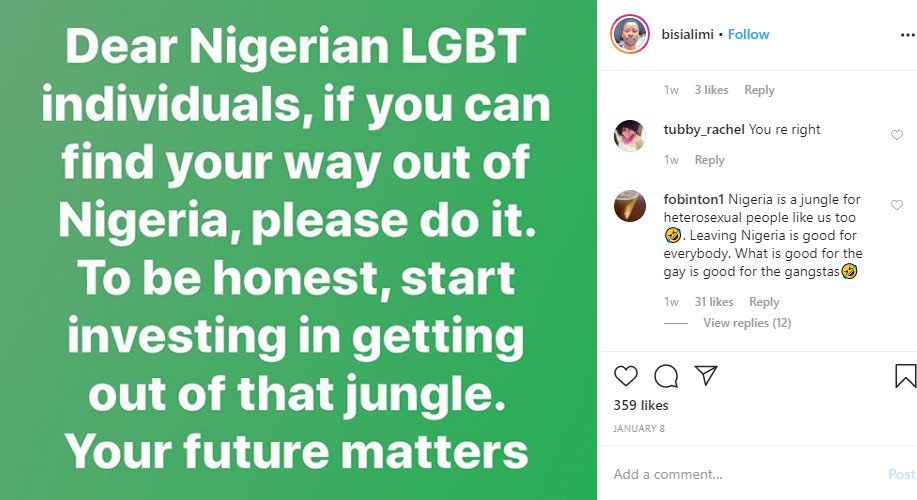 ”Dear Nigerian LGBTQ Individuals, if you can find your way out of Nigeria please do it. To be honest, start investing in getting out of that jungle. Your future matters.”