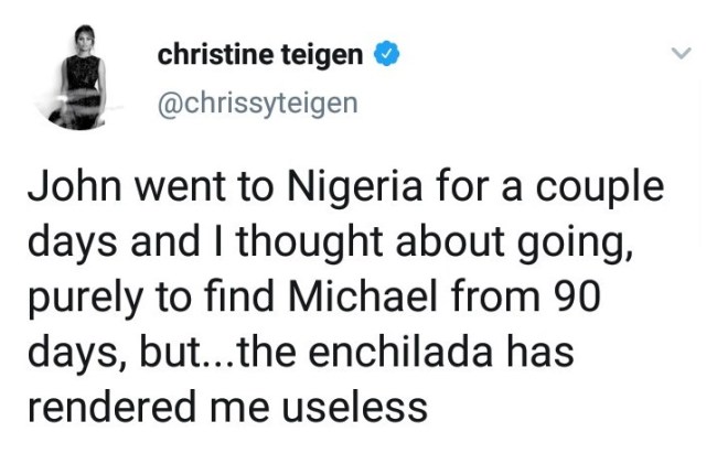 “John went to Nigeria for a couple days and I thought about going, purely to find Michael from 90 days, but…the enchilada has rendered me useless,” the model said.