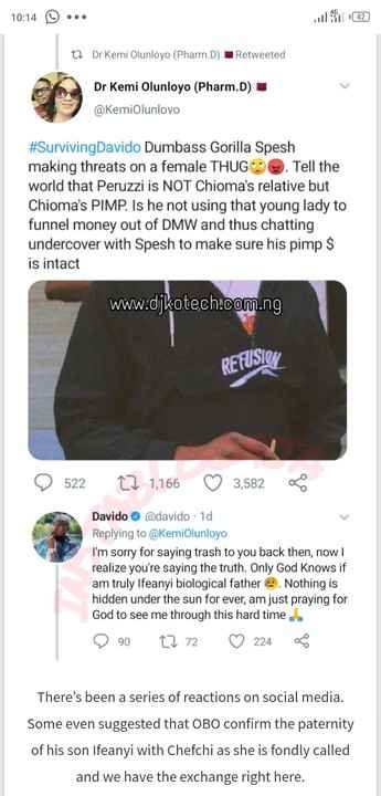 Few days after the allegation, the screenshot of a supposed tweet by Davido, which was a reply to controversial Journalist, Kemi Olunloyo’s tweet about Peruzzi being Chioma’s pimp.