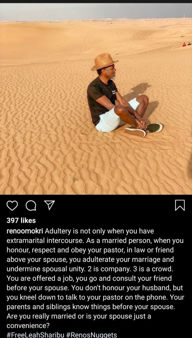 “Adultery is not only when you have extramarital intercourse. As a married person, when you honour, respect and obey your pastor, in law or friend above your spouse, you adulterate your marriage and undermine spousal unity. 2 is company. 3 is a crowd. You are offered a job, you go and consult your friend before your spouse. You don’t honour your husband, but you kneel down to talk to your pastor on the phone. Your parents and siblings know things before your spouse. Are you really married or is your spouse just a convenience?#FreeLeahSharibu #RenosNuggets”