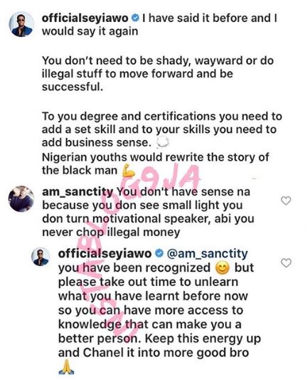 Big Brother Naija 2019 housemate, Seyi Awolowo, has been slammed by a follower who did not agree with his views on ‘illegal money’.
