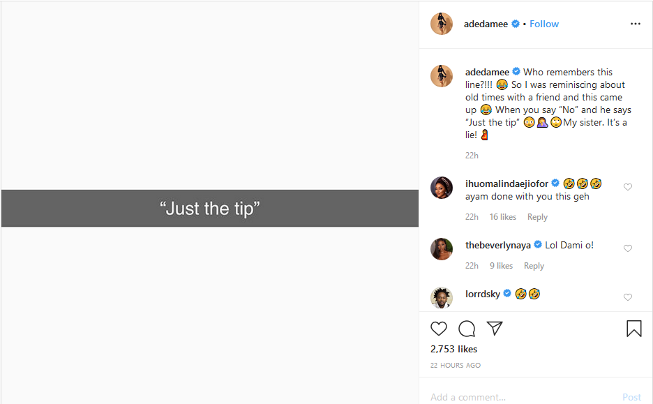 She posted a photo of the statement “Just the tip” and reminisced over old memories of that time. Although not all guys utilized the deceitful statement, it was once widely used when a guy tells you he wants to insert ‘just the tip’.
