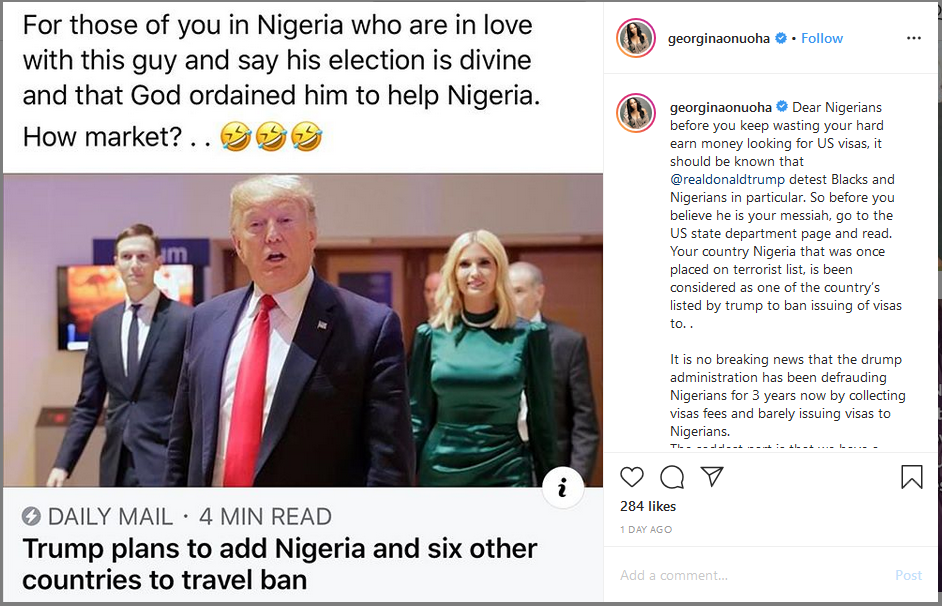 “Dear Nigerians before you keep wasting your hard earn money looking for US visas, it should be known that @realdonaldtrump detest Blacks and Nigerians in particular. So before you believe he is your messiah, go to the US state department page and read. Your country Nigeria that was once placed on terrorist list, is been considered as one of the country’s listed by trump to ban issuing of visas to. .