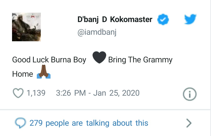 Taking to Twitter, D’banj wrote that he would love to see Burna bring the prestigious award home.