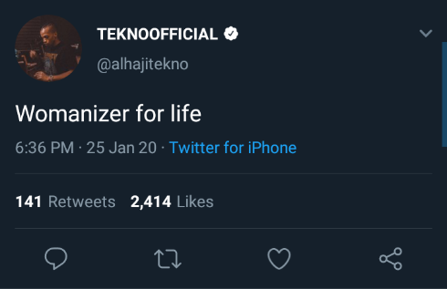 Nigerian singer, producer, performer and dancer, Augustine Miles Kelechi, simply known as Tekno has reiterated his love for women once again after declaring himself a ‘womanizer for life.’