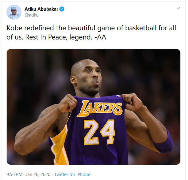 One of those who have reacted to the death of Kobe is the former Peoples Democratic Party, PDP, presidential candidate, Atiku Abubakar.