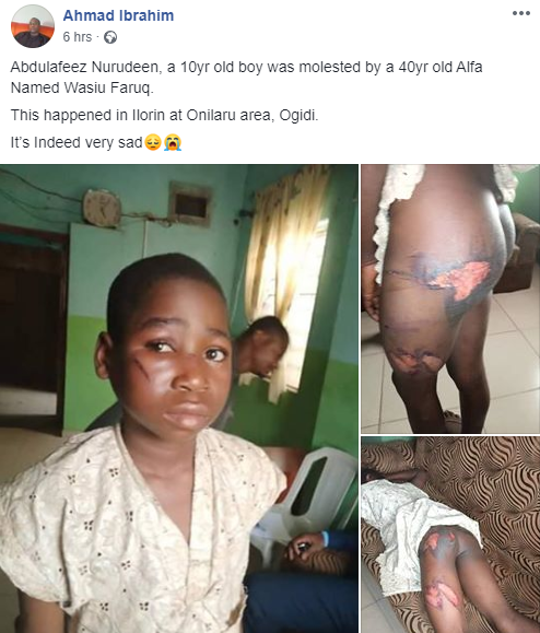 Abdulafeez Nurudeen, a 10yr old boy was molested by a 40yr old Alfa Named Wasiu Faruq.