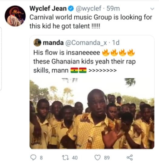 The video was well viewed by Twitter users and when rapper Wyclef Jean saw it, he gave a shout out to the upcoming rapper and added that his company, Carnival world music Group, is “looking” for the boy.