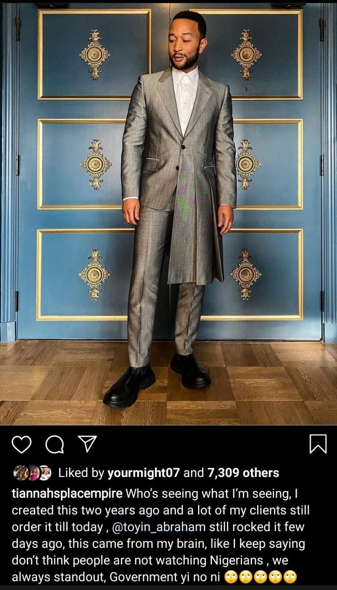 Celebrity fashion designer and entrepreneur, Toyin Lawani took to social media to accuse Singer, John Legend’s stylist of stealing her design.