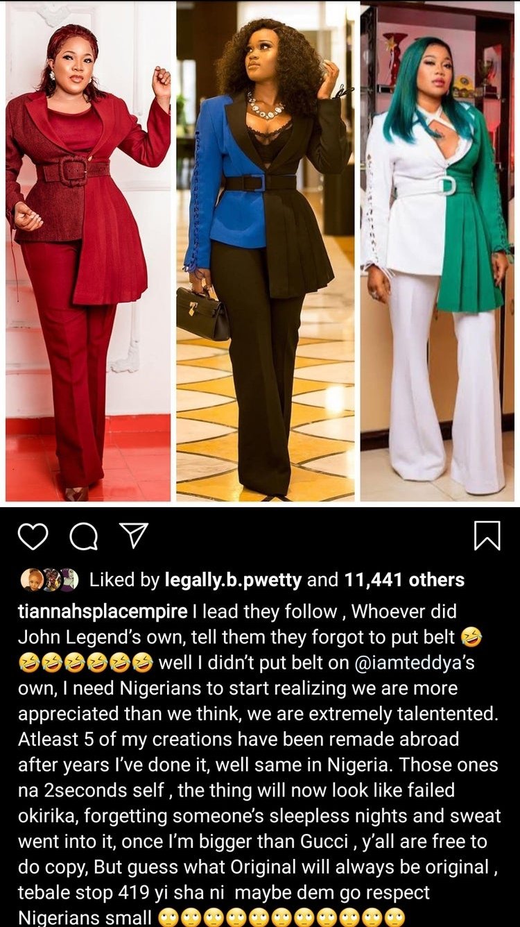 Lawani took to her Instagram page to share a photo of the singer in a look alike version of one of the outfits that she made for some Nigerian celebrities, the fashion designer went on full rampage against her fellow fashion designers.