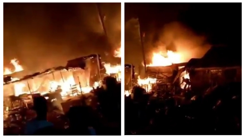 Inside the video, a yet-to be identified man can be seen pointing towards the market stalls where kolanuts are being sold that have been razed by fire.