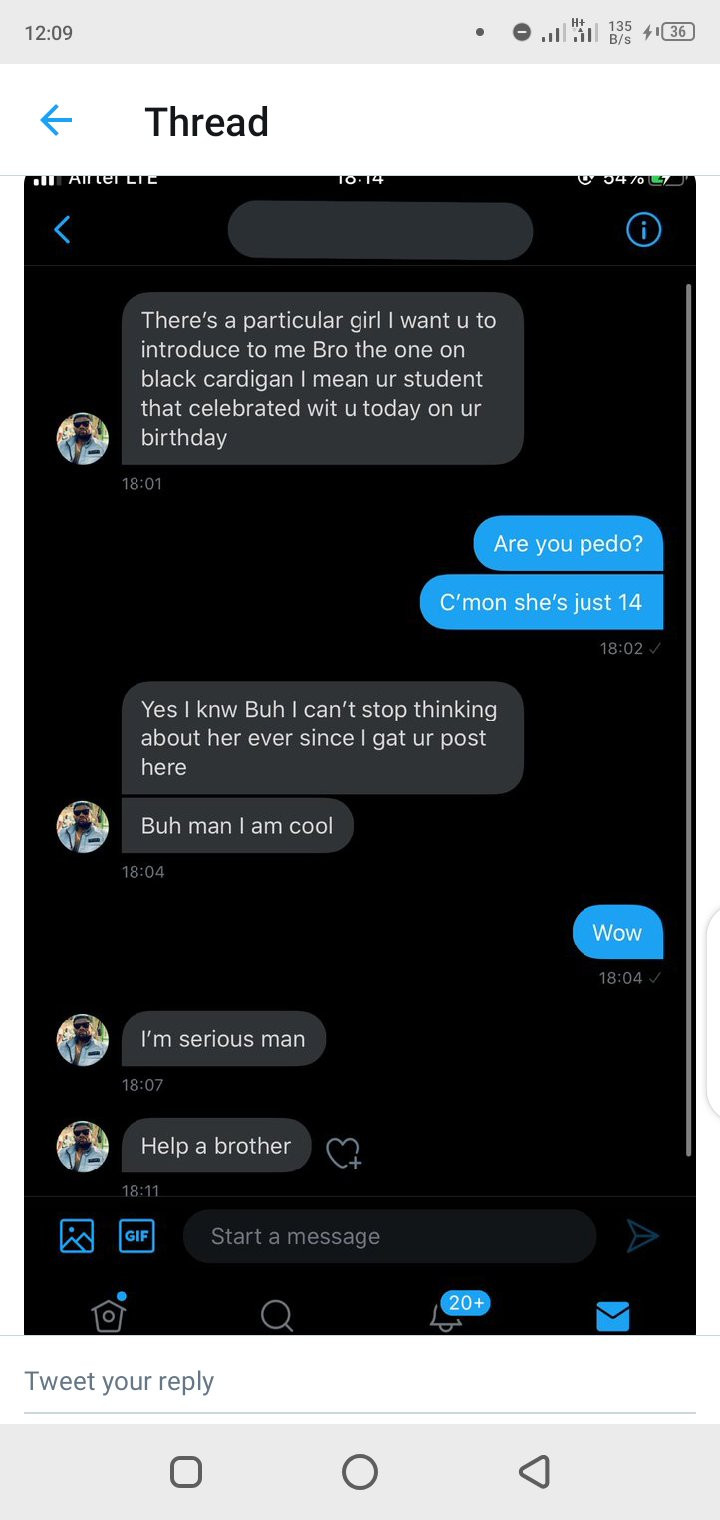 A Nigerian man has been tagged a pedophile after he begged to be introduced to a 14-year-old female student.