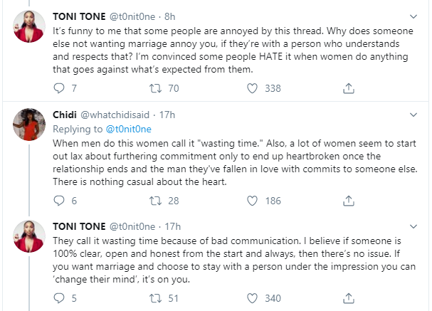 She also pointed out that while some women are more interested in marriage, others aren’t ready for marriage but still value romantic relationships. Toni Tones urged romantic partners to be clear on what they want from their relationship.