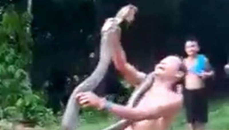 The villagers were waved away by the snake handlers when they came to assist and he continued with his bizarre routine.