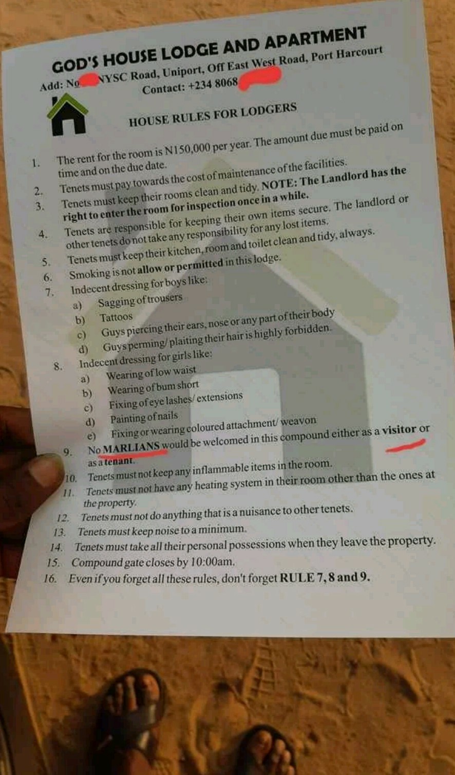 A landlord whose house is situated close to University of Port Harcourt, while laying down the rules in his house, stated in clear terms that he doesn’t accommodate marlians.