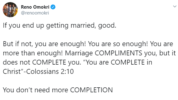 Omokri who is popular with sharing his nuggets, is of the opinion that marriage does not complete anyone but rather compliments.