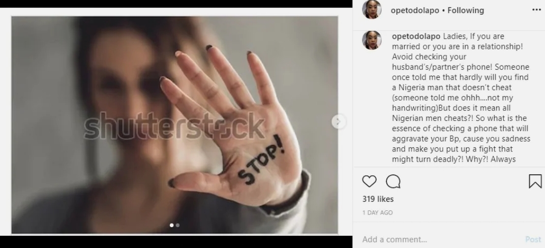 “Ladies, If you are married or you are in a relationship! Avoid checking your husband’s/partner’s phone! Someone once told me that hardly will you find a Nigeria man that doesn’t cheat. But does it mean all Nigerian men cheats?! So what is the essence of checking a phone that will aggravate your Bp, cause you sadness and make you put up a fight that might turn deadly?!”