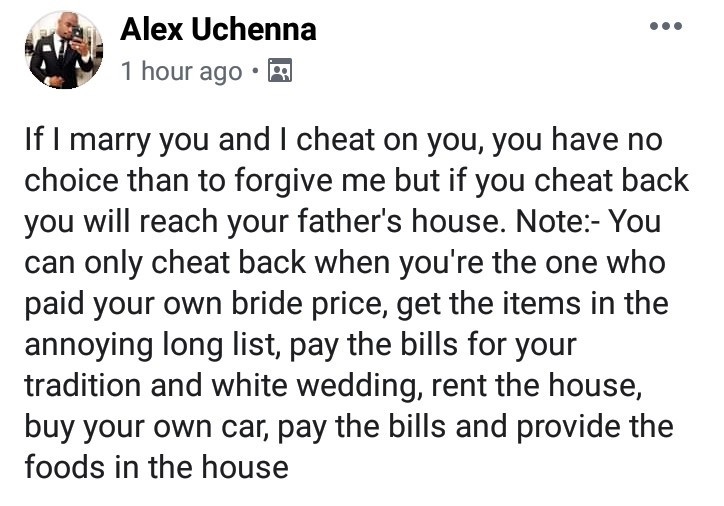 A young man identified as Alex Uchenna has taken to his Facebook page to lay out the conditions under which his future wife can cheat as a pay back anytime he cheats on her.