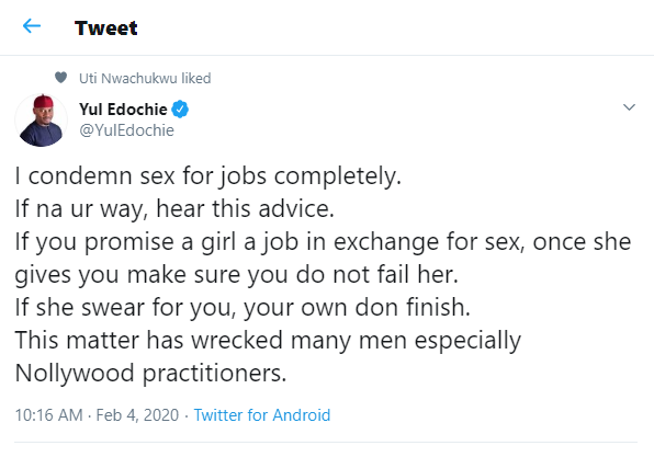 Yul said, in part, “If you promise a girl a job in exchange for sex, once she gives you make sure you do not fail her.”