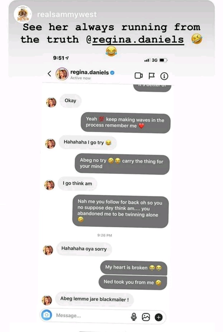 Sammy also playfully stated that he is heartbroken because the actress’ husband, Ned Nwoko took her away from him. Reacting to this, Regina told him to leave her alone and she called him a ‘blackmailer’.