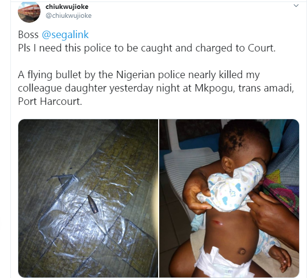 A baby was nearly killed after a stray bullet allegedly fired by a police officer at Mkpogu community of Trans Amadi, Port Harcourt nearly killed a baby.
