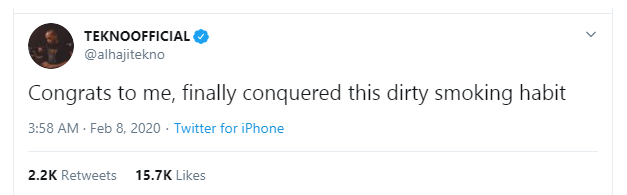 Nigerian singer, producer, performer and dancer, Augustine Miles Kelechi, simply known as Tekno has announced that he has quit smoking which he described as a “dirty habit”.