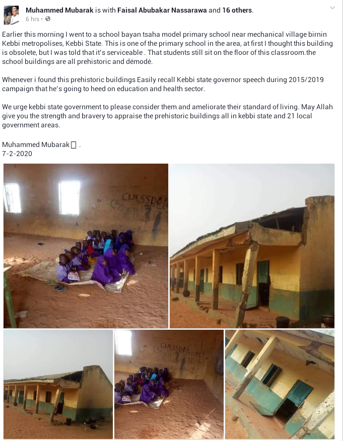 “Few hours ago I posted a picture of bayan tasha model primary school here in birnin kebbi, kebbi state metropolis some so called SSA to the governor on media false it, that the school is okay,