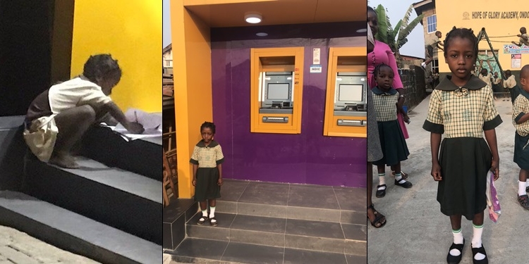 “I saw this little Dele at FCMB Bank along Yaba Road in Ondo City. She is using the ATM Gallery light to do her homework. My respect goes to her determination to make it in life. Let it go viral.”