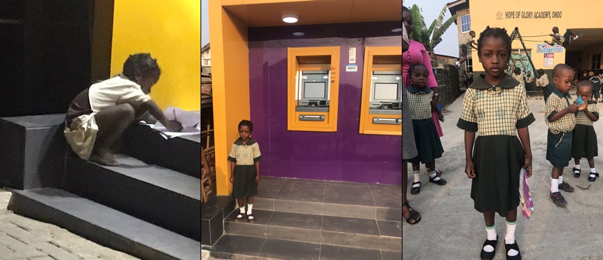 Dele, a young school girl was found using First City Monument bank (FCMB) ATM Gallery’s light to do her homework in Ondo Town, Ondo state