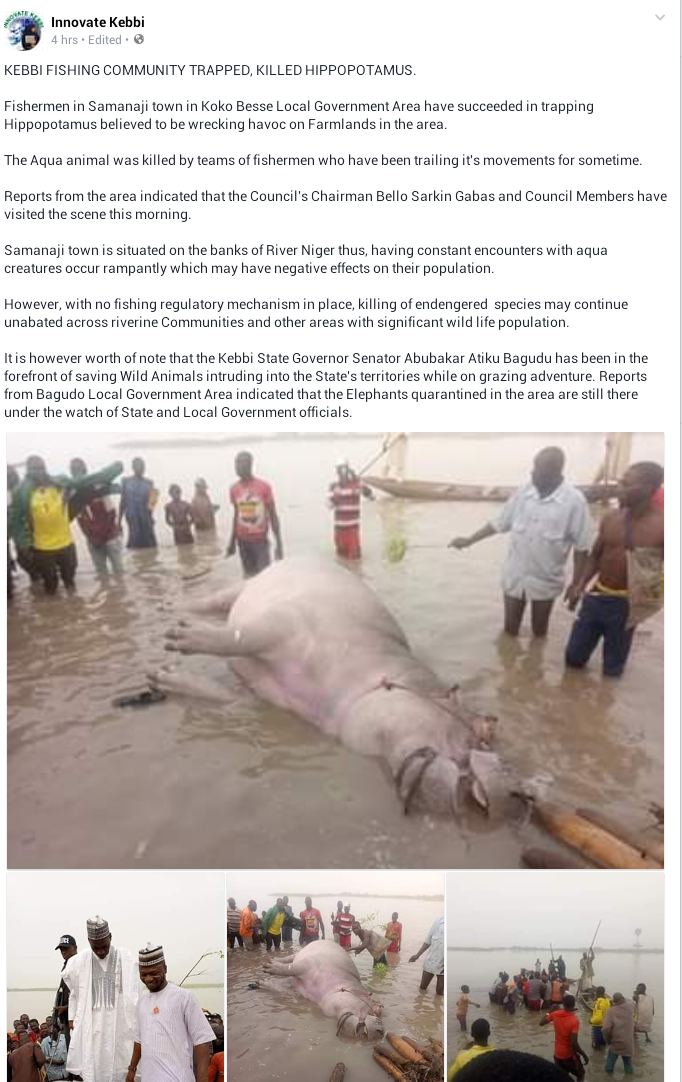 A hippopotamus has been trapped and killed by fishermen in Samanaji town in Koko Besse Local Government Area of Kebbi State.